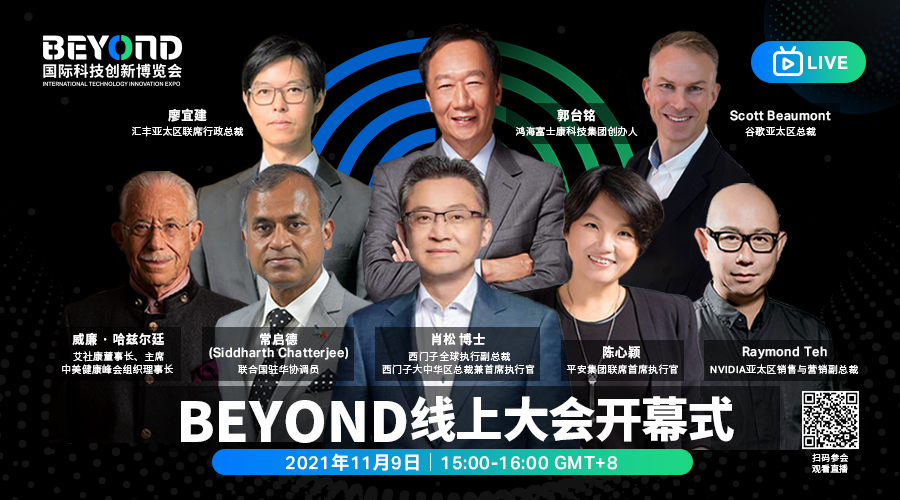 2021年11月9日,BEYOND世界科技立异饱览会线上峰会开幕式正式举行。作为亚太地区最具影响力的科技立异饱览会,本次线上大会开幕式约请到了包含:鸿海富士康科技集团创办人郭台铭、西门子全球履行副总裁、西门子大中华区总裁兼首席履行官肖松;安全集团联席首席履行官陈心颖;联合国驻华协调员Siddharth Chatterjee(常启德);谷歌亚太区总裁Scott Beaumont;汇丰亚太区联席行政总裁廖宜建;艾社康董事长、主席、中美健康峰会安排理事长威廉·哈兹尔廷;NVIDIA亚太区销售与营销副总裁Raymond Teh等重量级嘉宾(以上嘉宾排序依照开幕式讲演顺序排列)。
